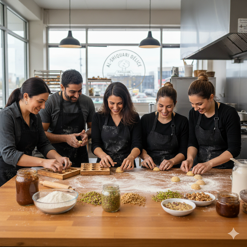 At Al-Shuqairi Délice, quality is not a promise – it is a standard. We work exclusively with carefully sourced ingredients: fragrant spices, fine butters, and hand-selected nuts that honour the traditions from which our recipes arise. Our menu blends the delicate sophistication of French pâtisserie with the soulful warmth of Middle Eastern confections. From hand-pressed Ma’amoul and syrup-kissed Baklava to velvet tarts and golden éclairs, each offering is crafted to captivate both palate and heart.